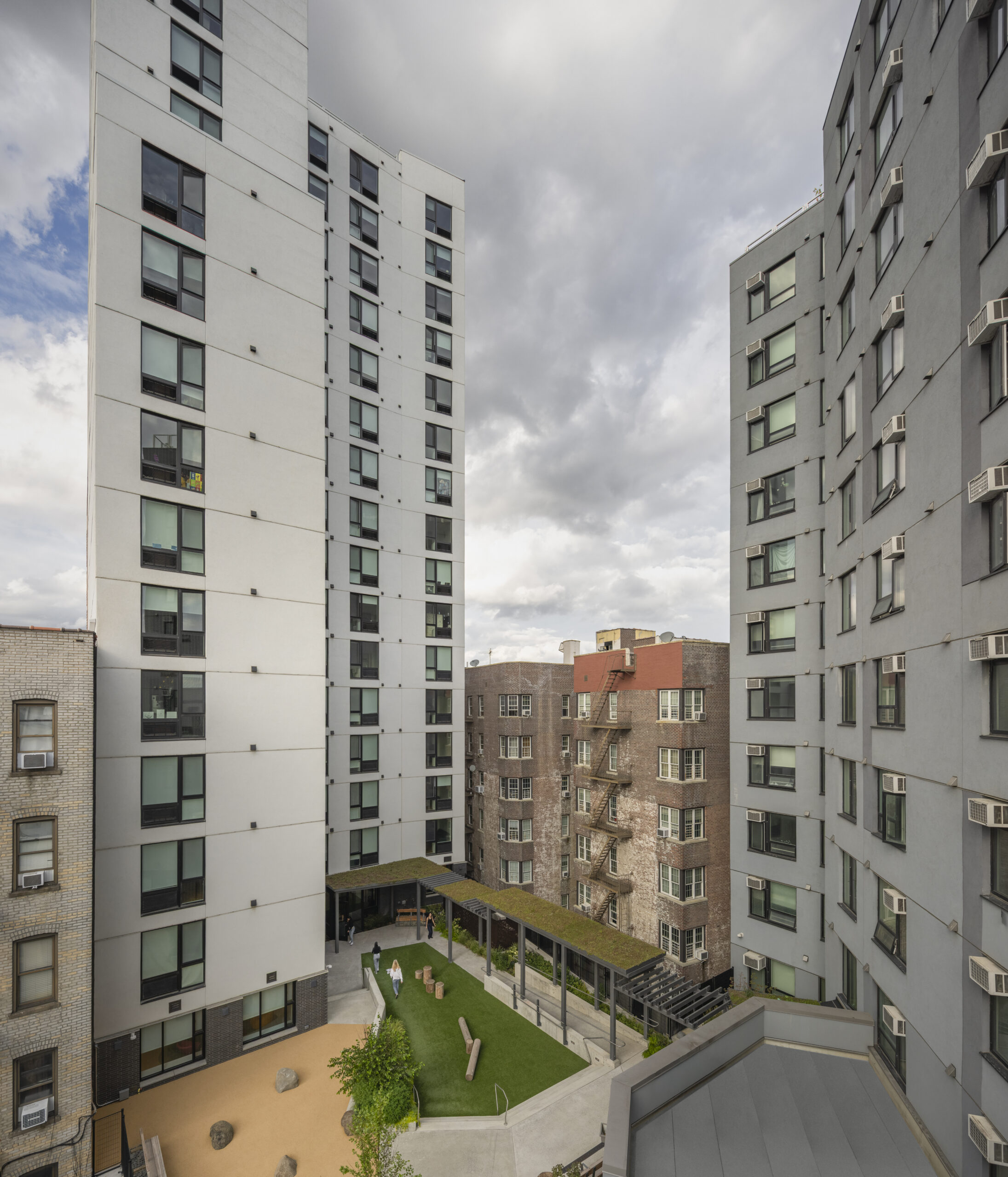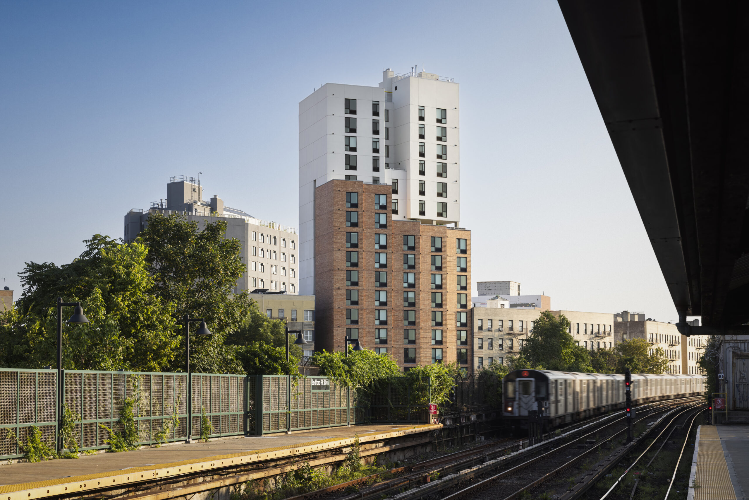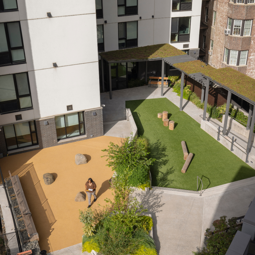 The Bedford Green House Complex is a two-building, LEED-certified supportive housing community providing more than 230 affordable homes alongside wraparound, on-site services and amenities. These include a rooftop greenhouse and aquaponics system, an occupational therapy suite, the Molly B. Kronick Library and Learning Center, and a community medical clinic.