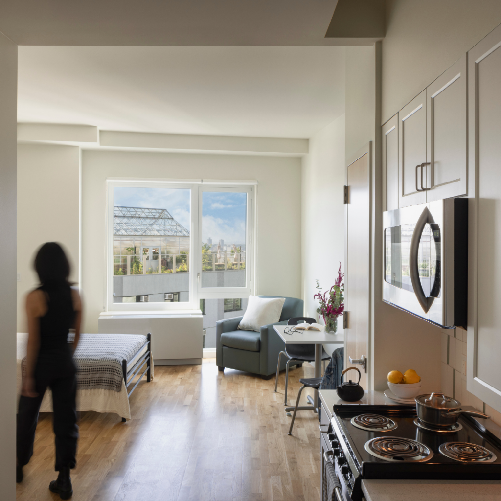 The building also features a street-facing, 2,300-square-foot community medical clinic, set to open in 2026, which will offer primary care, pediatrics, psychiatry, and other health services to residents and members of the broader community.